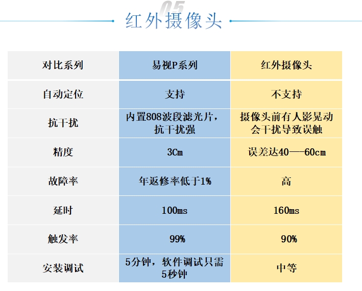| 5秒自动校正:少维护,节省人工成本 | 速度快:120英寸以上产品是红外框响应速度的2-3倍 |